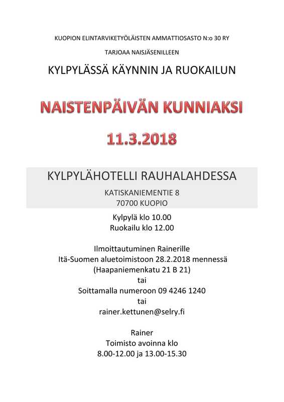 KUOPION ELINTARVIKETYÖLÄISTEN AMMATTIOSASTO N:o 30 RY TARJOAA NAISJÄSENILLEEN KYLPYLÄSSÄ KÄYNNIN JA RUOKAILUN KYLPYLÄHOTELLI RAUHALAHDESSA KATISKANIEMENTIE 870700 KUOPIO